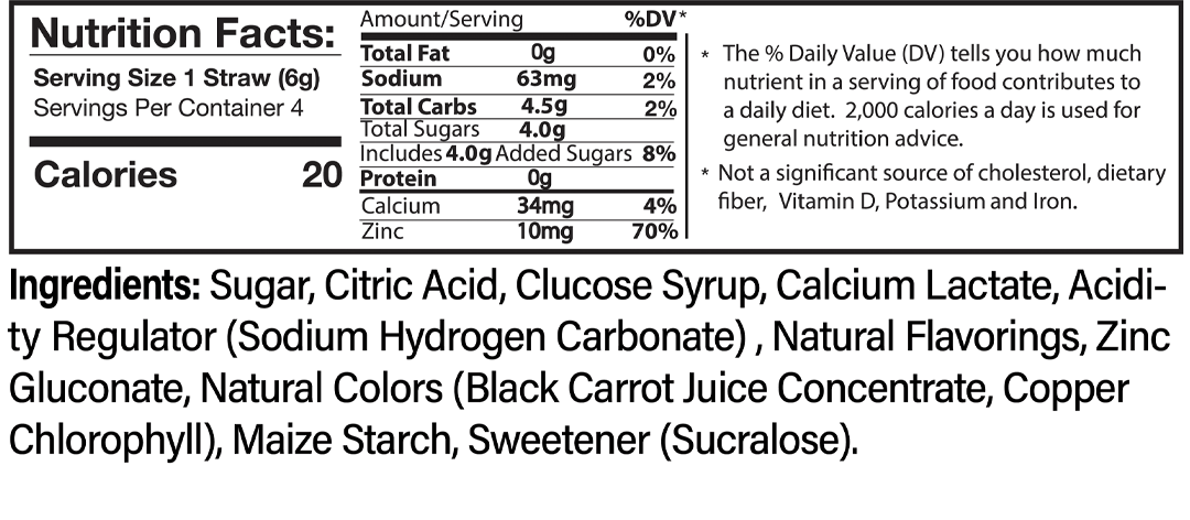 Sugar, Citric Acid, Glucose Syrup, Calcium Lactate, Acidity Regulator (Sodium Hydrogen Carbonate), Natural Flavorings, Zinc Gluconate, Natural Colors (Black Carrot Juice Concentrate, Copper Chlorophyll), Maize Starch, Sweetener (Sucralose)