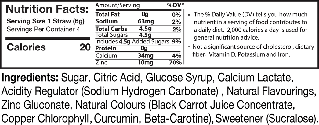 Sugar, Citric Acid, Glucose Syrup, Calcium Lactate, Acidity Regulator (Sodium Hydrogen Carbonate), Natural Flavorings, Zinc Gluconate, Natural Colors (Black Carrot Juice Concentrate, Copper Chlorophyll, Curcumin, Beta-Carotene), Sweetener (Sucralose)